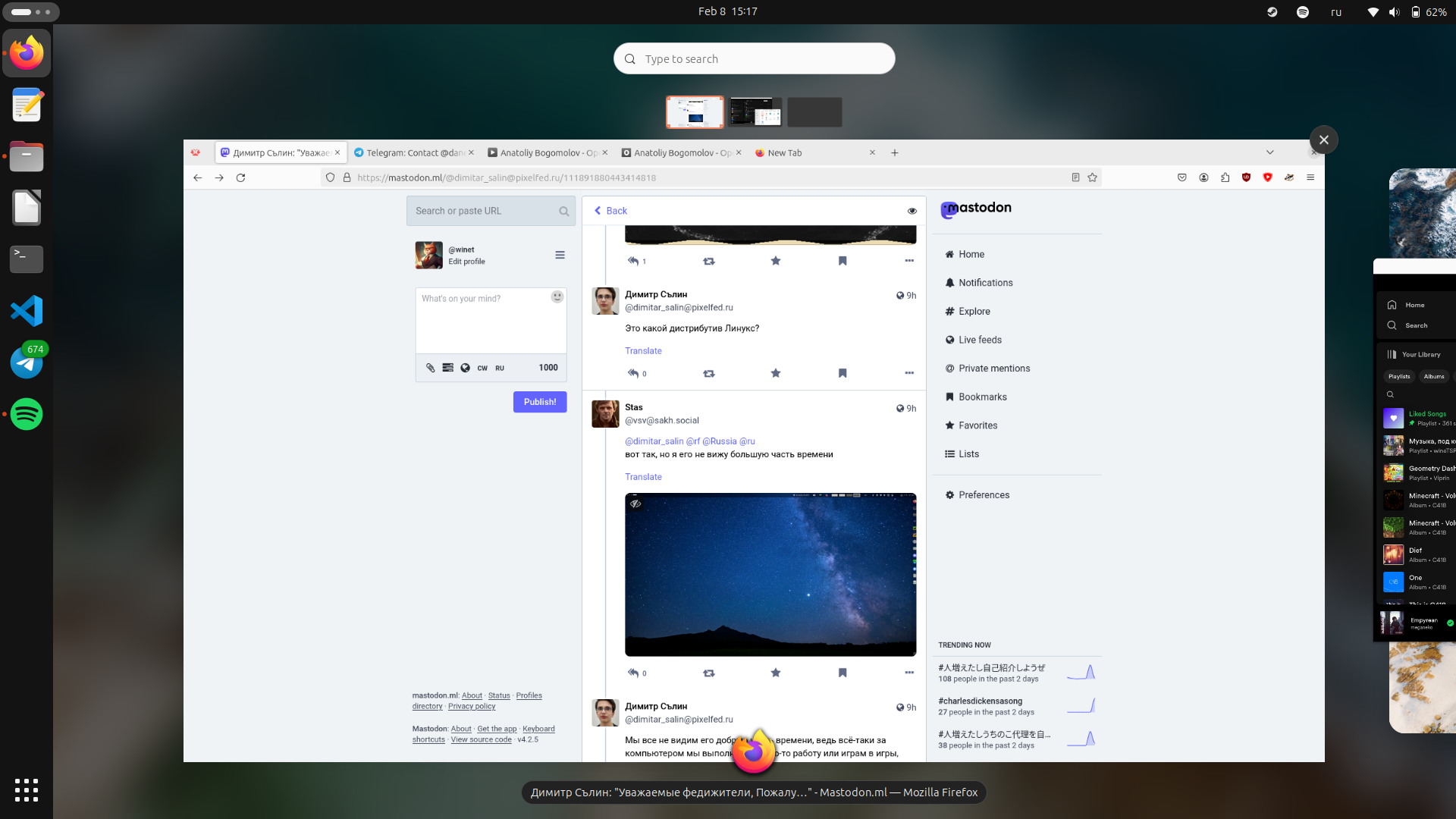 @dimitar_salin @rf @Russia @ru Чистая убунта без снапов. Только flatpak. Вообще обычно пользуюсь федорой, но на моём ноуте не работал сон, поэтому пока остановился на этом чуде.